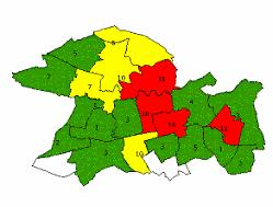 Each Ward is displayed in either Red , Amber or Green, depending in whether the KPIs Threshold values are reached or exceeded.