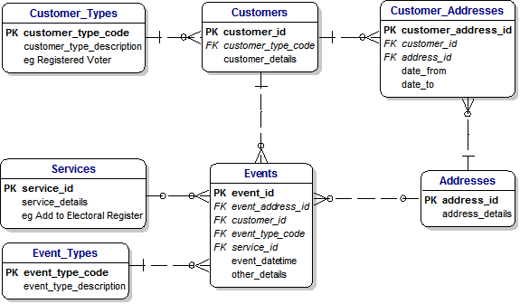 A CUSTOMER can be associated with zero, one or many CUSTOMER EVENTs .