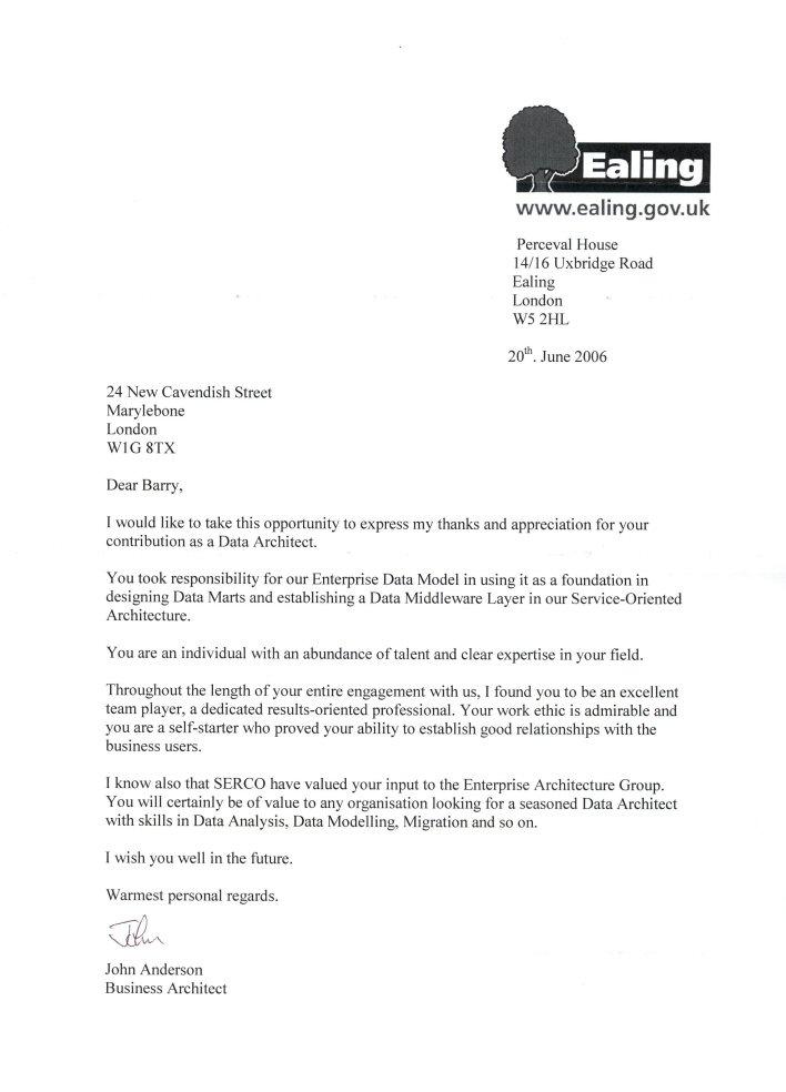 Letter of Appreciation from John Anderson at the London Borough of Ealing