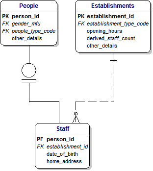 In the diagram, we show this with a Foreign Key by the establishment_id field in the Staff Entity.